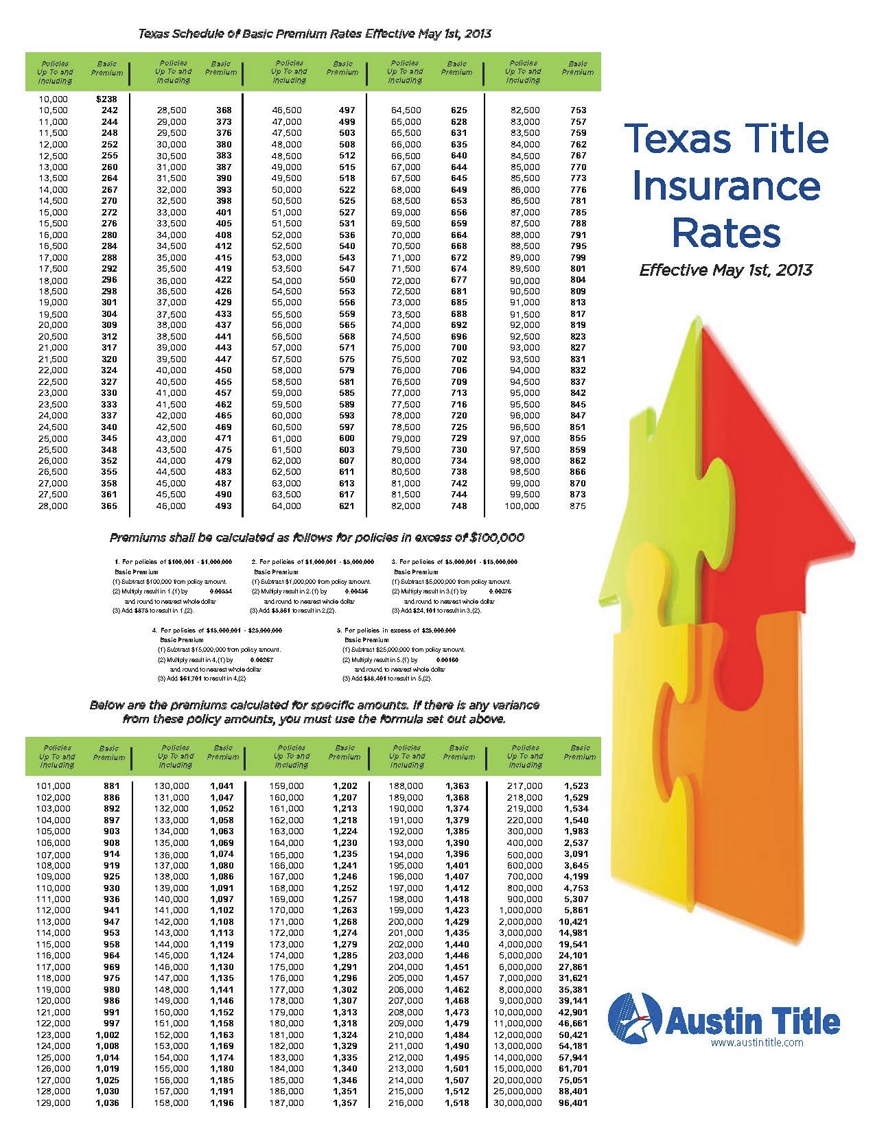 Sep 01, 2019 · texas title insurance premium rates as of september 1, 2019. How much are title fees in texas? Although independence title works hard to ensure that the title insurance rates, closing costs, recording fees and other information made available on our website. An owner's policy stays in effect as long as you or your heirs own the property. All title companies will charge the same premium for a policy. If you buy from an unlicensed agent, any claims you have could go unpaid. There are two kinds of title polices. How much does a title transfer cost in texas? How much is homeowners insurance in texas? Keep your owner's policy, even if you transfer your title or sell the property. When the new loan pays off the existing loan, the old loan policy expires. A loan policy covers up to the amount of the principal on your loan. Please be sure to enter an amount of at least $10,000.00 as this is the basic minimum premium amount that a policy will be issued for by the state of texas.